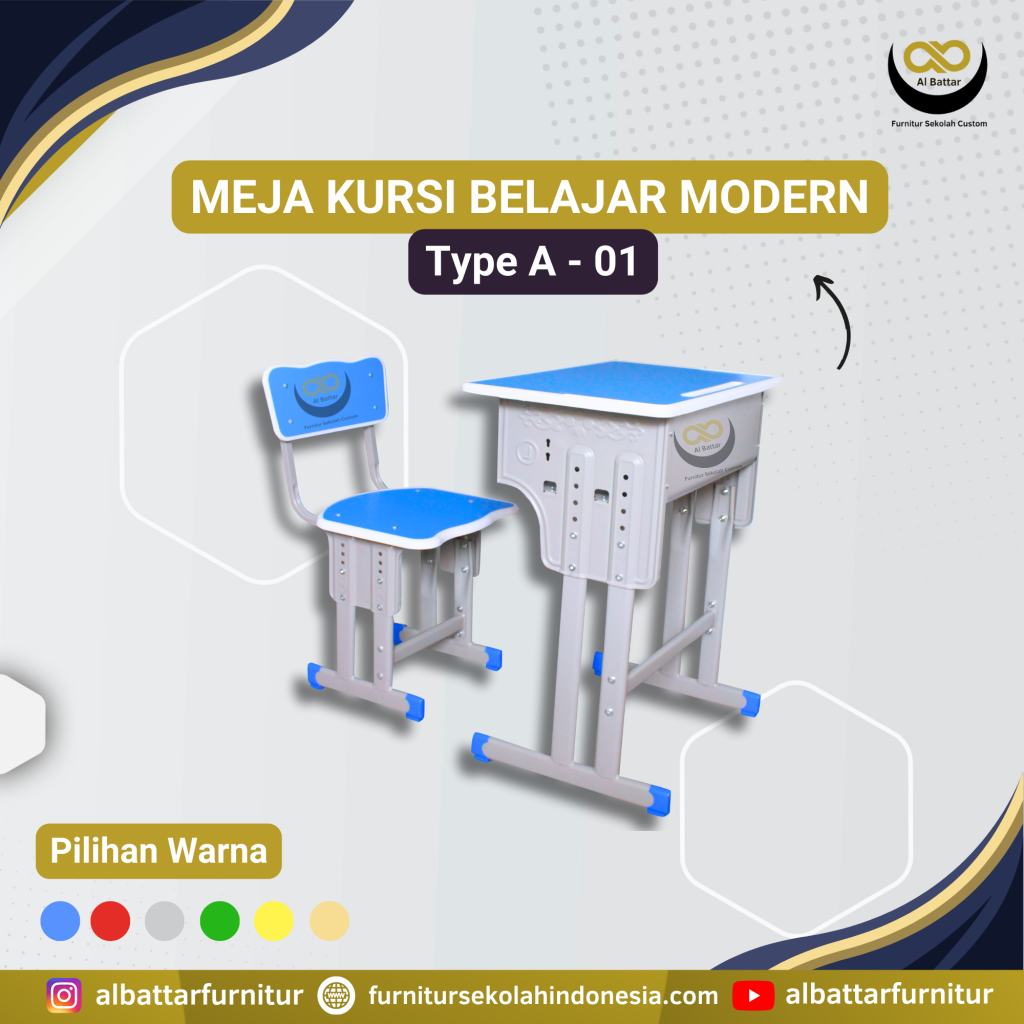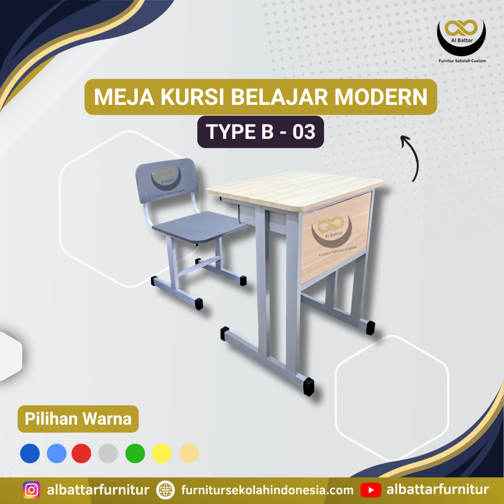 Albattar furnitur memiliki berbagai macam model, bahan serta warna yang bisa dipilih. Kami menggunakan rangka meja kursi meja belajar yang berkualitas, serta menggunakan meja kursi yang dicat dengan teknik powder coating sehingga cat lebih tahan lama, dan bisa digunakan dalam jangka panjang. Untuk Type B yaitu tipe lokal kami produksi sendiri mengunakan papan meja berbahan hpl yang berkualitas dan memiliki variasi warna yang beragam, yang bisa kalian pilih.