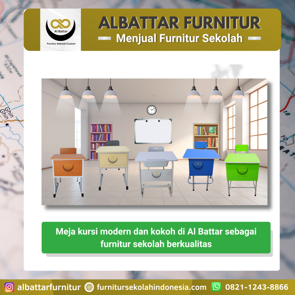 Fasilitas belajar yang nyaman dan berkualitas menjadi salah satu faktor penting untuk mendukung proses belajar mengajar. Furnitur utama yang berada di ruang kelas yaitu meja kursi siswa yang digunakan setiap hari, sehingga harus dirancang dengan baik dan fungsional. Al Battar hadir menyediakan meja kursi modern yang kokoh dan dapat menunjang kenyamanan serta tampilan kelas. Meja kursi Al Battar hadir dengan desain modern minimalis yang disesuaikan dengan kebutuhan sekolah saat ini.